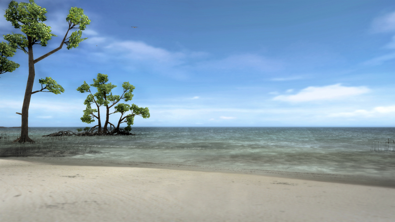 浅く広く続く白浜に悠然と根を張る木々。